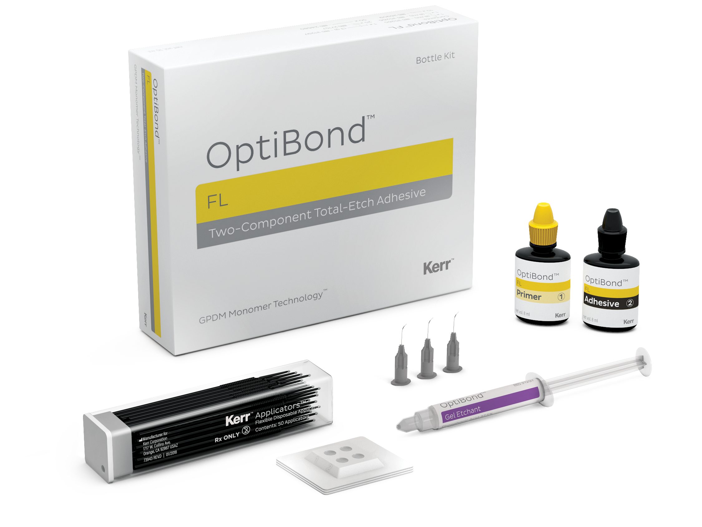 Двухкомпонентная адгезивная система OptiBond™ FL (Оптибонд ФЛ) . OptiBond™ FL успешно используется во всем мире c 1995 г., подтверждая свое качество в долгосрочных клинических исследованиях. Он признан «золотым» стандартом ведущими стоматологическими институтами мира и неоднократно получал награды Reality Five Star Award и The Dental Advisor.